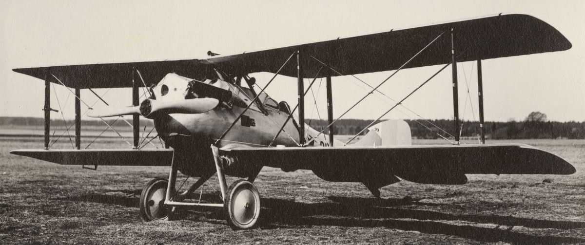 Flygplan J 2, Nieuport 29C-1 märkt nr 39 (69) står på flygfältet på Malmen, 1927. Vy framifrån.