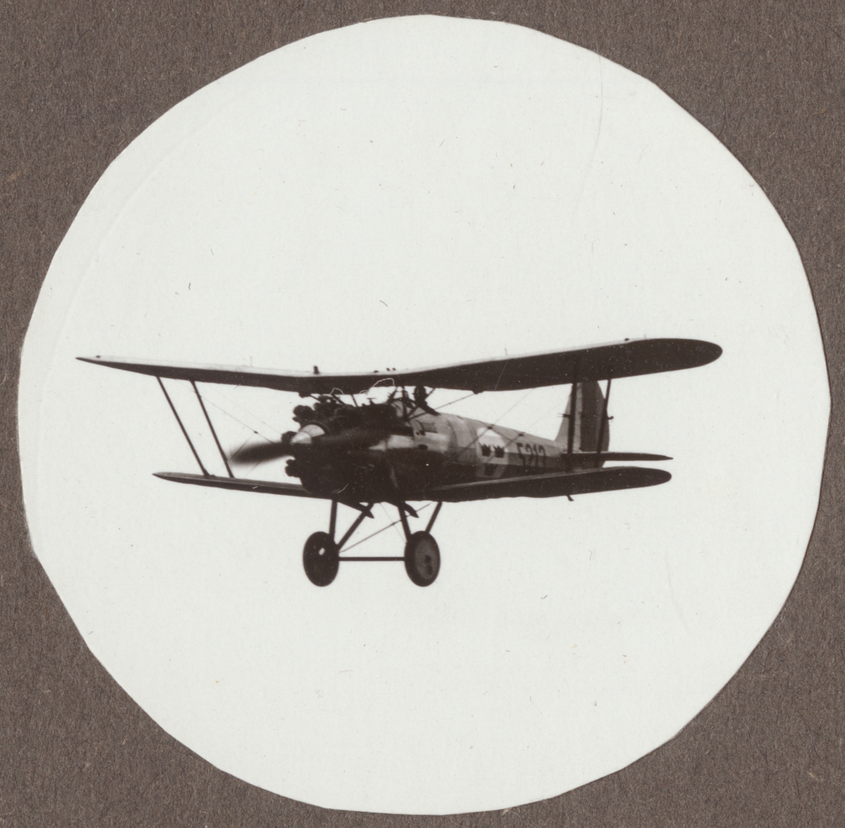 Flygplan J 7, Bristol Bulldog i luften på låg höjd. Vy snett framifrån.