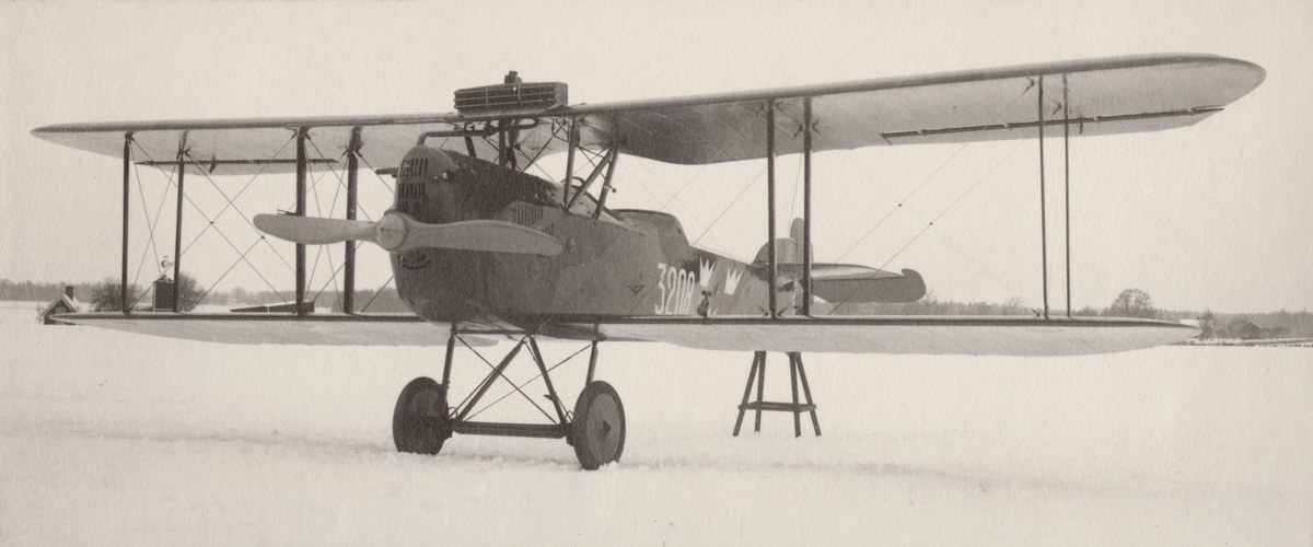Flygplan FVM S 21 nr 3208 på bock på flygfältet på Malmen, vintertid.