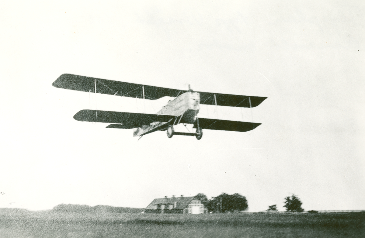 Flygplan Bréguet XIV B.2 märkt S-AIAA i luften ovanför flygfältet på Malmen. Vid Nils Söderbergs provflygning av planet den 15 juli 1923, inför tävling i ILUG 1923.
