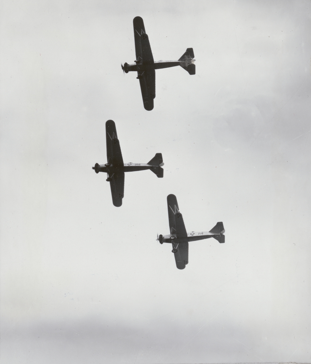 Tre flygplan S 6, Fokker C. VE i formationsflygning i luften, sett nedifrån, cirka 1926-1934. Flygbild.
