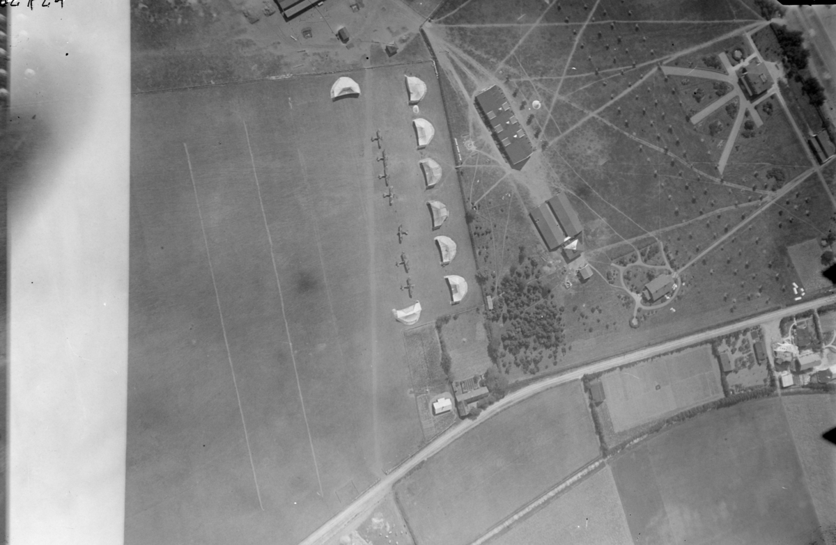 Flygfotografi av Rinkaby flygstation, 1924. Fotograferat från 900 meters höjd. Byggnader, tälthangarer och flygplan.