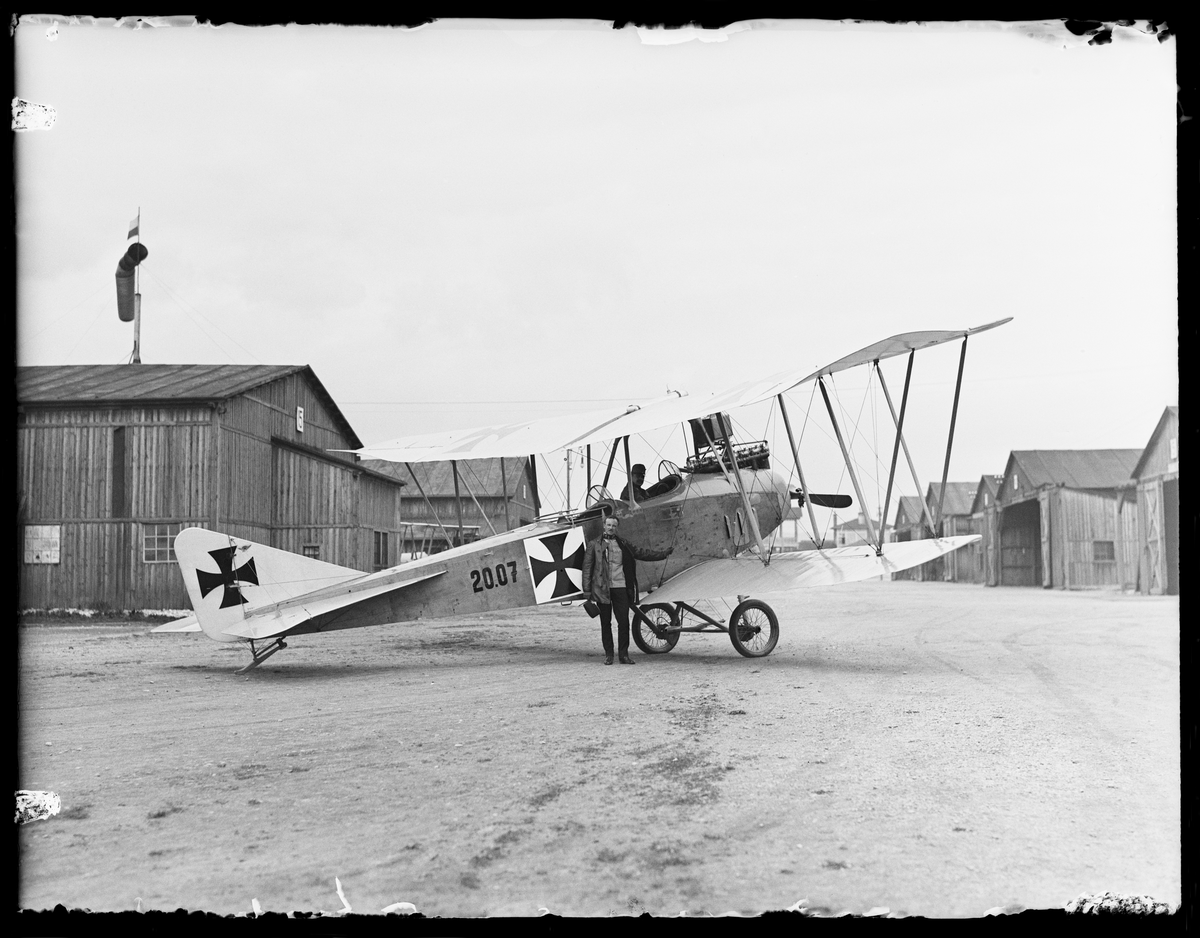 Militärt flygplan Albatros B.I märkt 20.07 tillhörande Österrike-Ungern står på en väg mellan flygplanshangarer. En man står vid flygplanet. I planet sitter en flygförare.