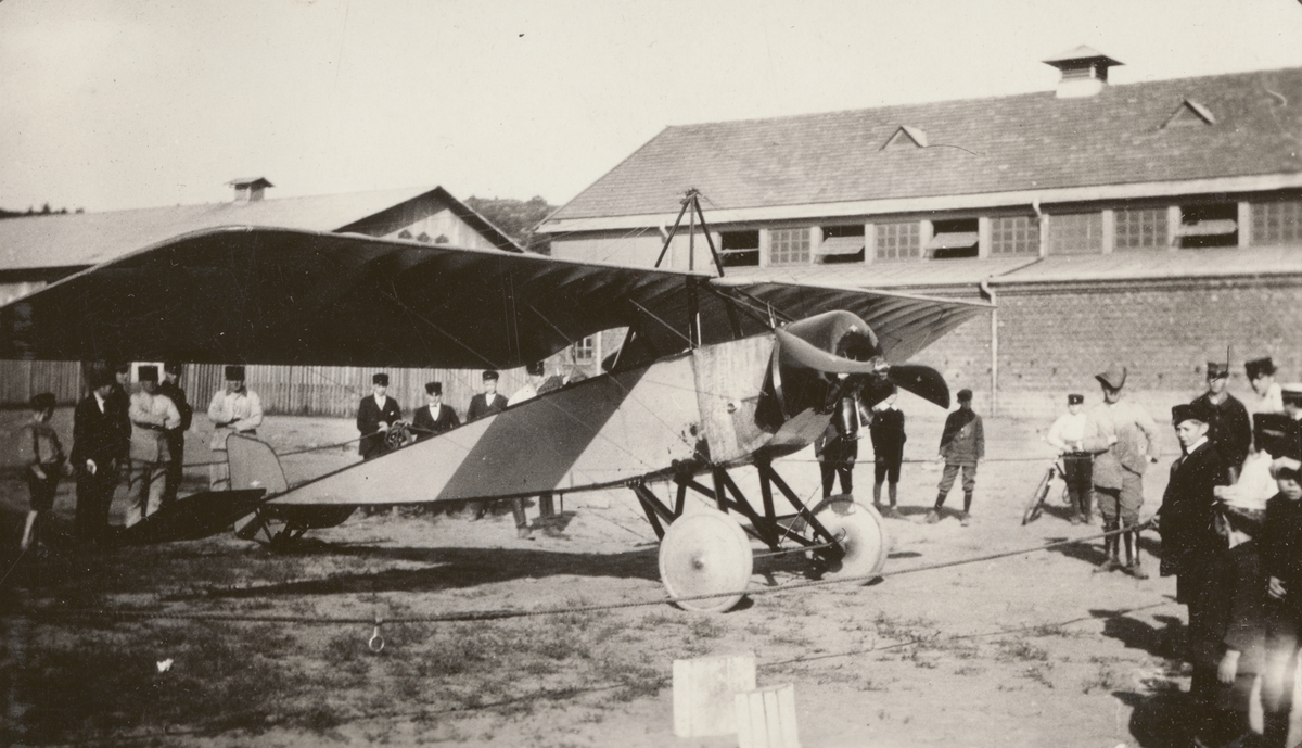 Flygplan Thulin D nummer D.1 visas upp utanför militära byggnader. Folksamling med militärer, civila och barn samlade utanför det inrepade flygplanet, 1915.