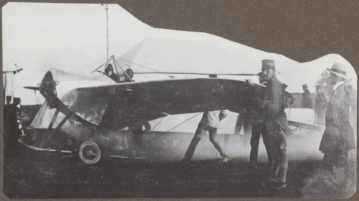 Flygplan M 2, Nieuport IV-G inför första provflygningen, på Malmen den 23 september 1913. I förarsitsen varmkör Gösta von Porat motorn. Längst till höger står Lars Fjällbäck (i hatt), till vänster om honom Allan Jungner.