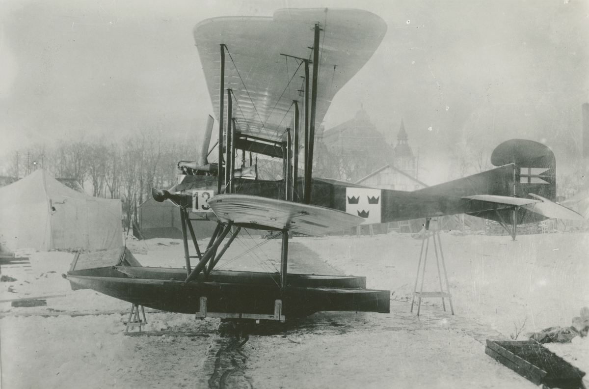 Marint flygplan Thulin G nr 13 (Flygbåt 13) uppställd vid Galärvarvet i Stockholm omkring 1917. Vy från sidan, vintertid.