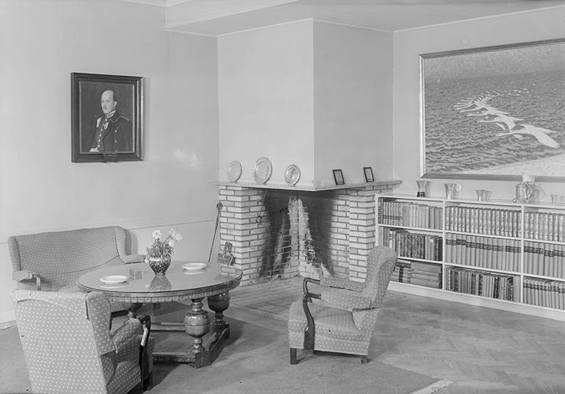 Rökrum på officersmässen på F 3 Malmen, 1945. Interiör ur två vinklar.