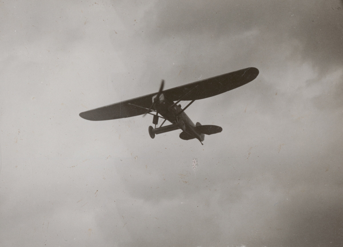 Flygplan FVM J 24 i luften. Flygbild nedifrån.