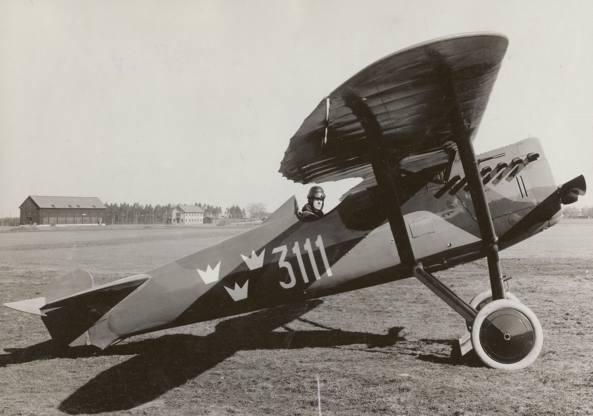 Flygplan FVM J 23 nr 3111 står på flygfältet på Malmen, 1923. Flygförare Georg Gärdin sitter på förarplatsen.