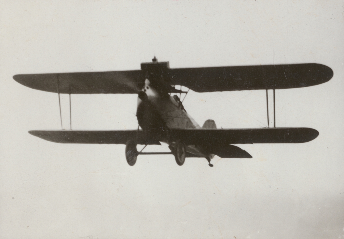 Flygplan Phönix D.II Phönixjagaren märkt nummer 947 i luften, 1925. Flygplanet är silvermålat. Vy framifrån.
