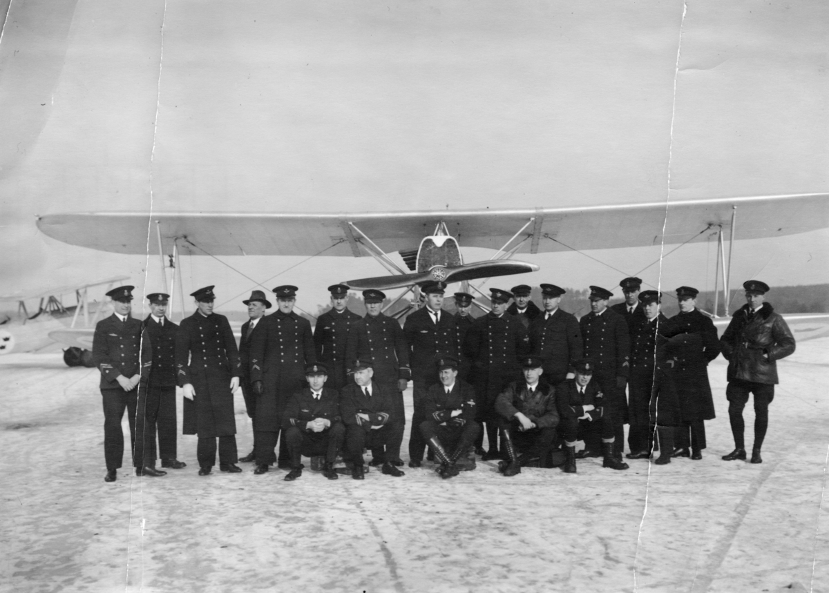 Grupporträtt av underofficerare vid F 2 Roslagens flygflottilj, 1929. Framför flygplan SK 6, vintertid.