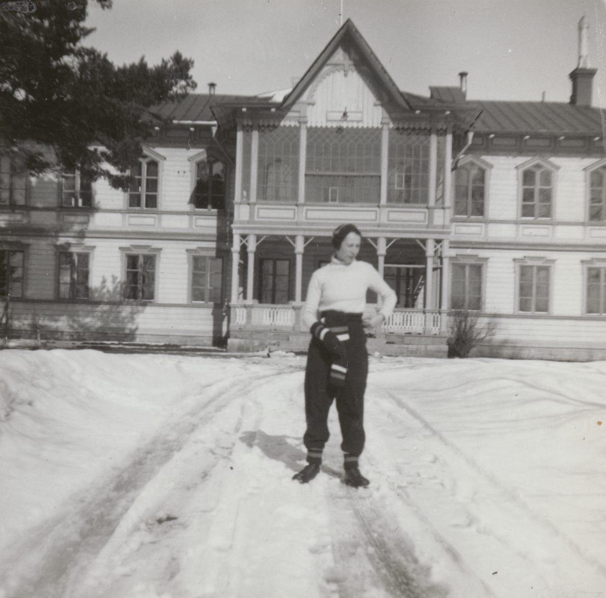 Porträttfoto av Anna Linderstam i skidklädsel utanför byggnad, vintertid, cirka 1925.