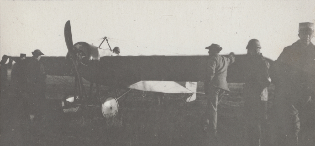 Flygplan Thulin B står på flygfält, omkring 1915-1916. Flygförare i flygplanet och folk runt omkring.
