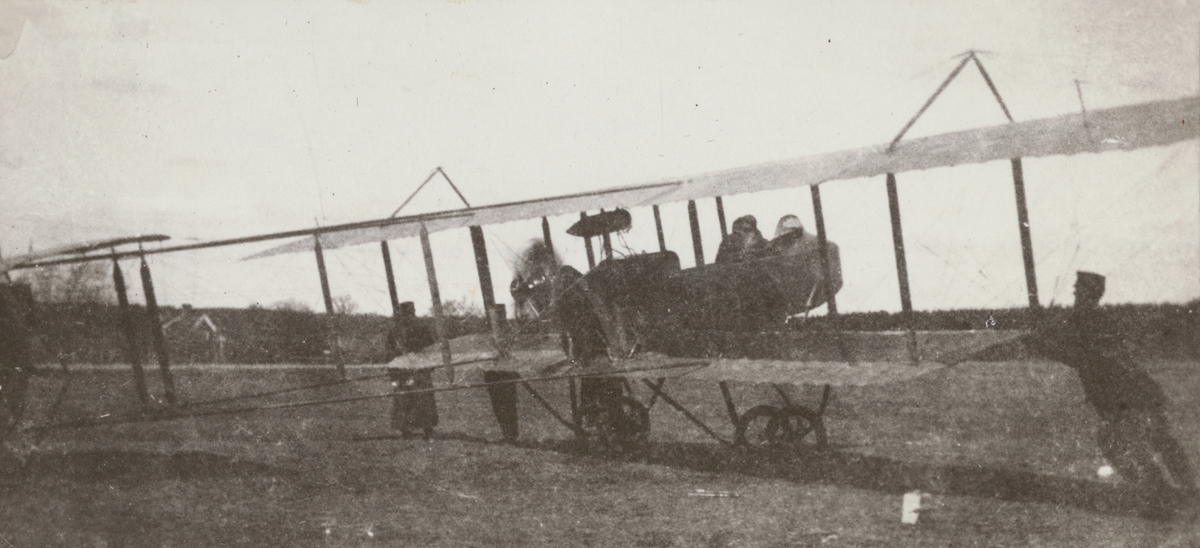 Flygplan SW 10 Farman med motor igång står på flygfältet på Malmen, cirka 1914-1915. Flygförare i flygplanet och personal ur Flygkompaniet i arbete bredvid. Vy bakifrån flygplanet.