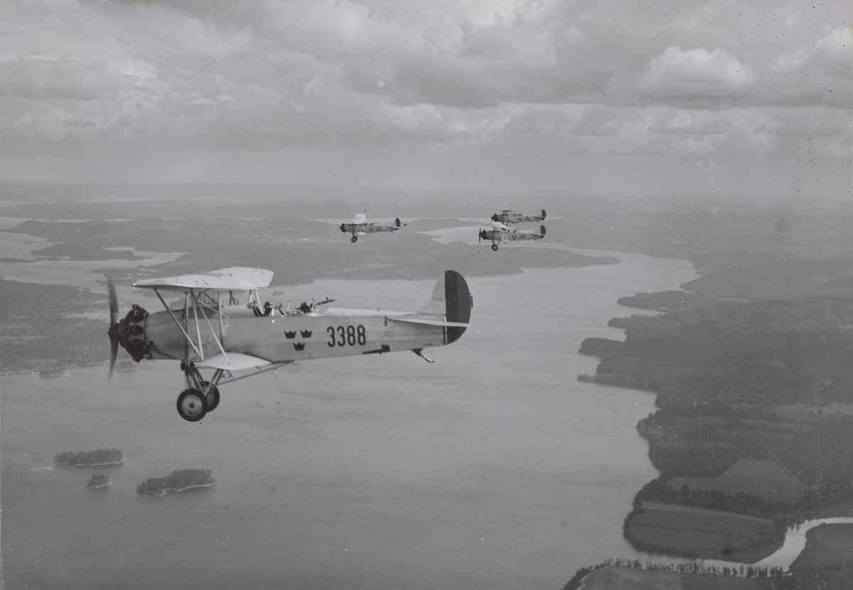 Fyra flygplan S 6, Fokker C. VE i luften över landskap, cirka 1930. Flygbild. Flygplan märkt 3337, 33386, 3387 samt 3388.