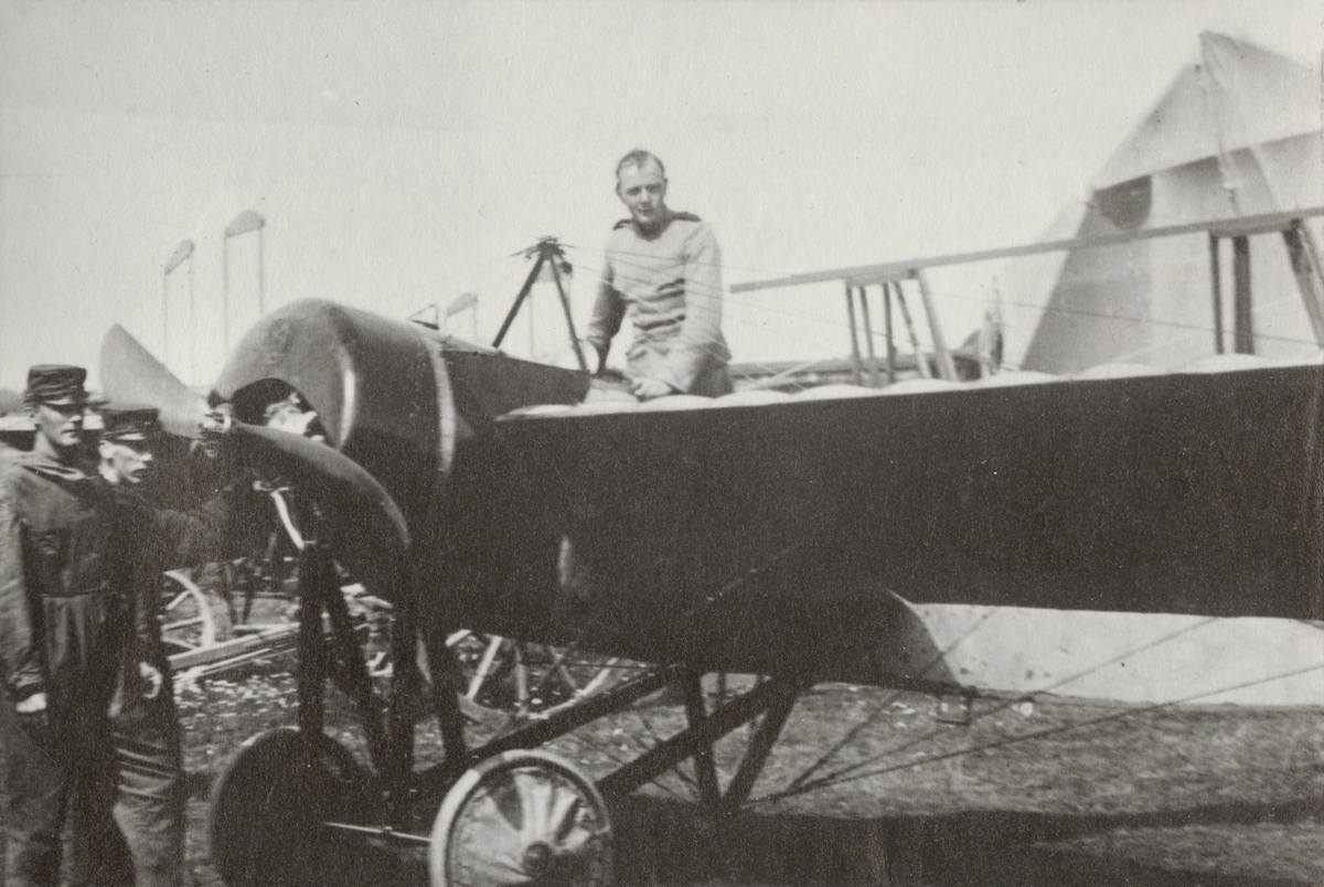 Flygföraren Nils Kindberg står i flygplan Morane-Saulnier MS 3L på flygfältet på Malmen, 1915.