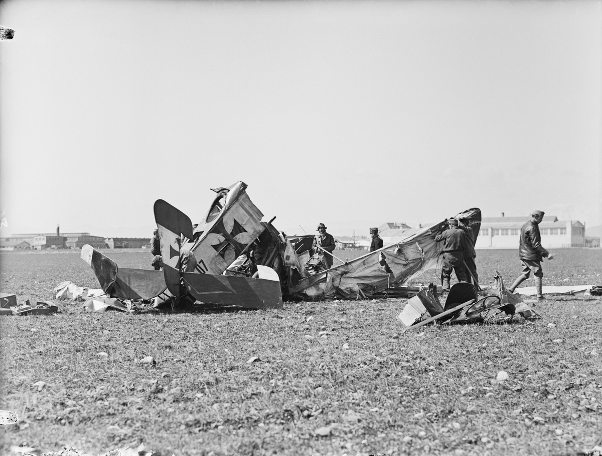 Havererat militärt flygplan Aviatik B.II märkt 32.07 tillhörande Österrike-Ungern ligger på ett flygfält. Militärer i rörelse kring flygplanet. Vy snett bakifrån.