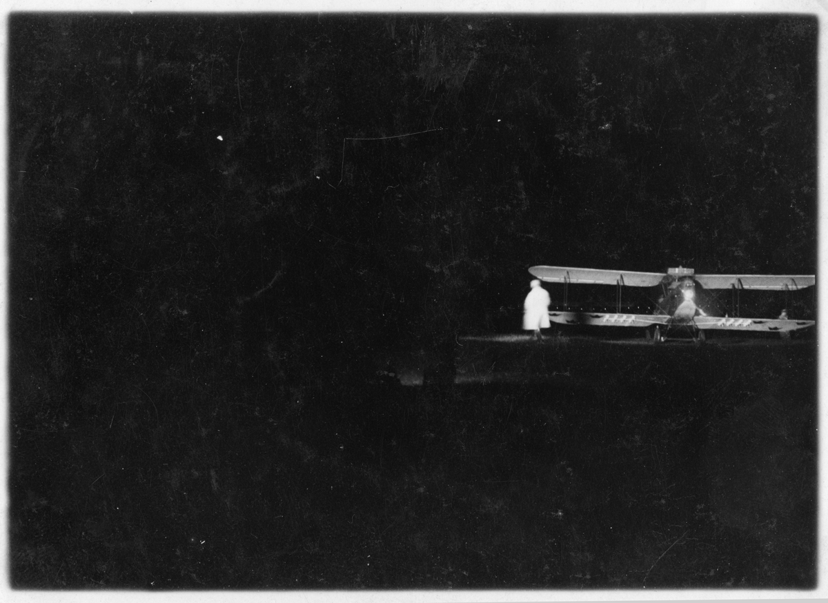 Klargöring av militärt flygplan på flygfält inför mörkerflygning för Flygkompaniet. En man vid flygplanet.
