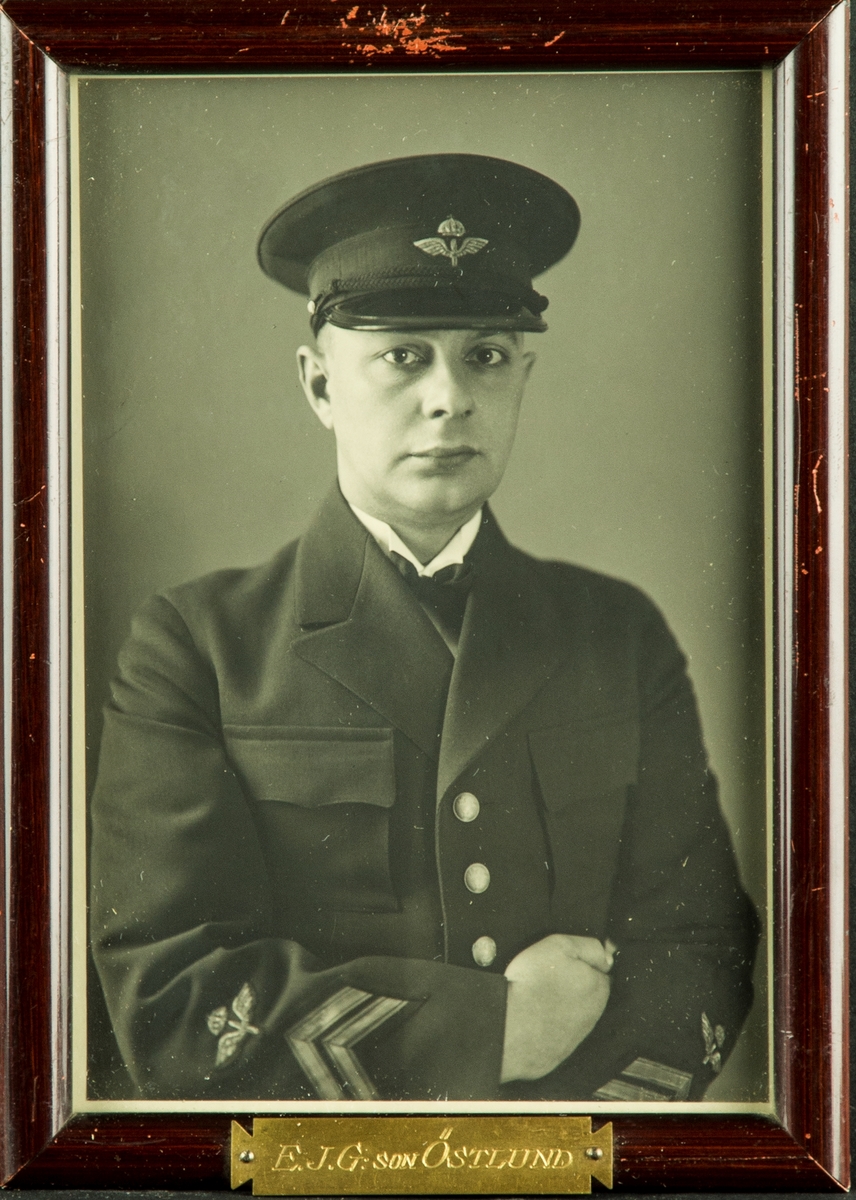 Porträttfotografi av militären E. J. G:son Östlund, kompaniofficer på F 3 Östgöta flygflottilj.