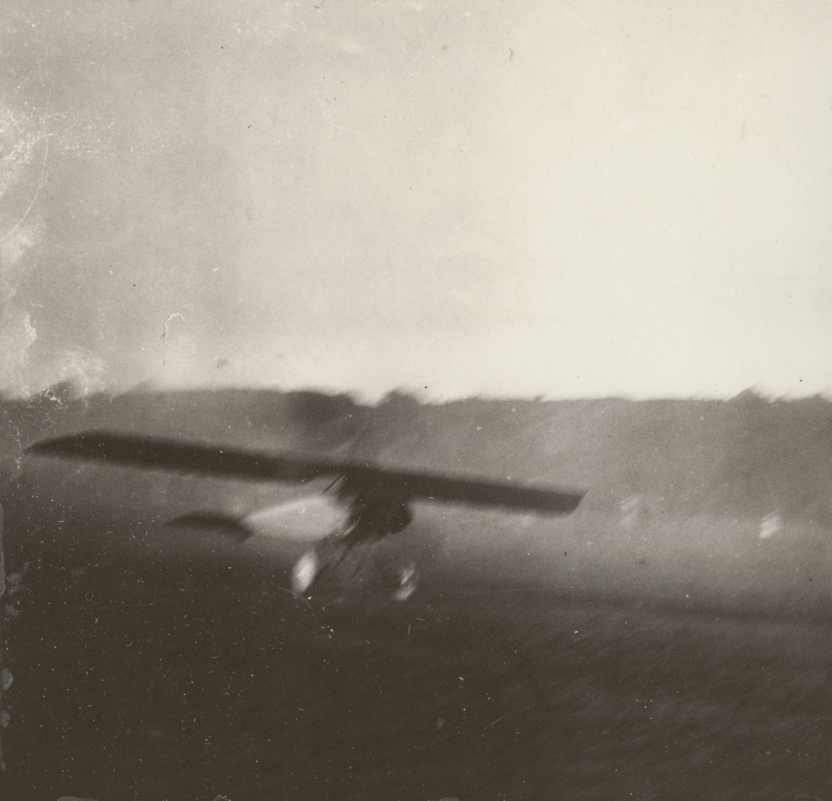 Flygplan Thulin D flyger på låg höjd över ett flygfält.
