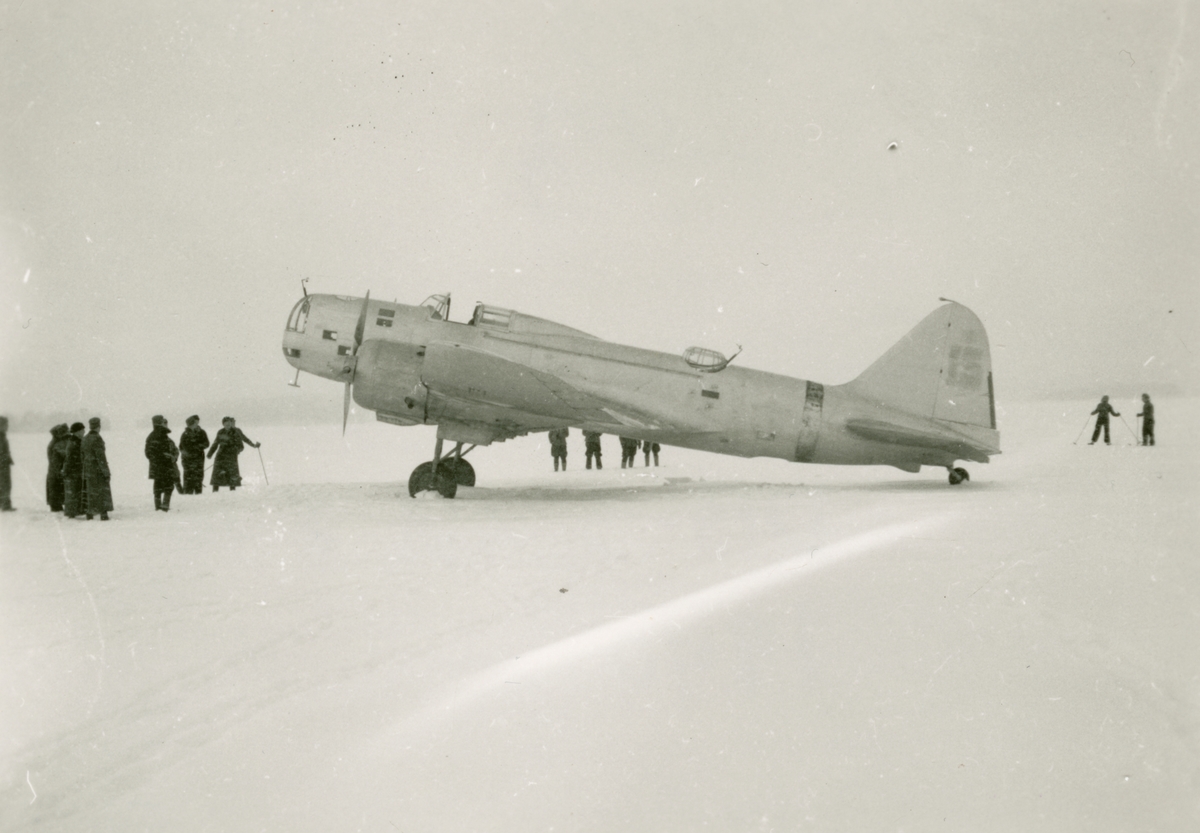 Sovjetiskt flygplan Iljushin DB-3 står på ett fält under finska vinterkriget, 1940. Människor i rörelse runtomkring. Bild från F 19, Svenska frivilligkåren i Finland.