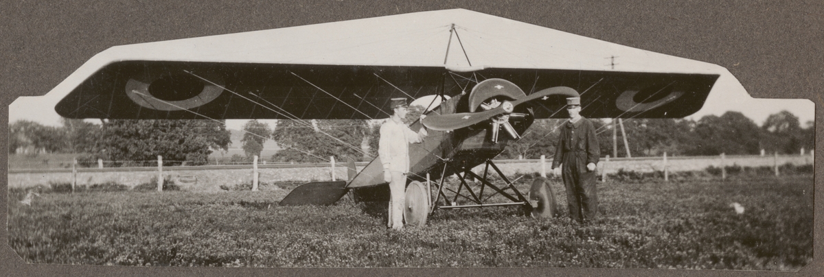 Flygplan Thulin D nummer D.1 med blågul kokard under vingarna och två värnpliktiga män står på flygfältet i Ljungbyhed inför Nils Kindbergs flygning till Malmen den 5 september.