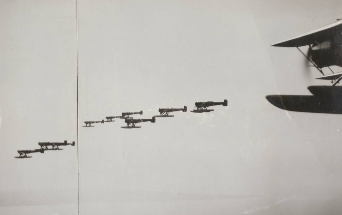 Fjärde spaningsdivisionens flygplan i luften, 1932. Nio flygplan S 5 flyger i formation. I förgrunden syns flygplan S 6 nummer 4392.