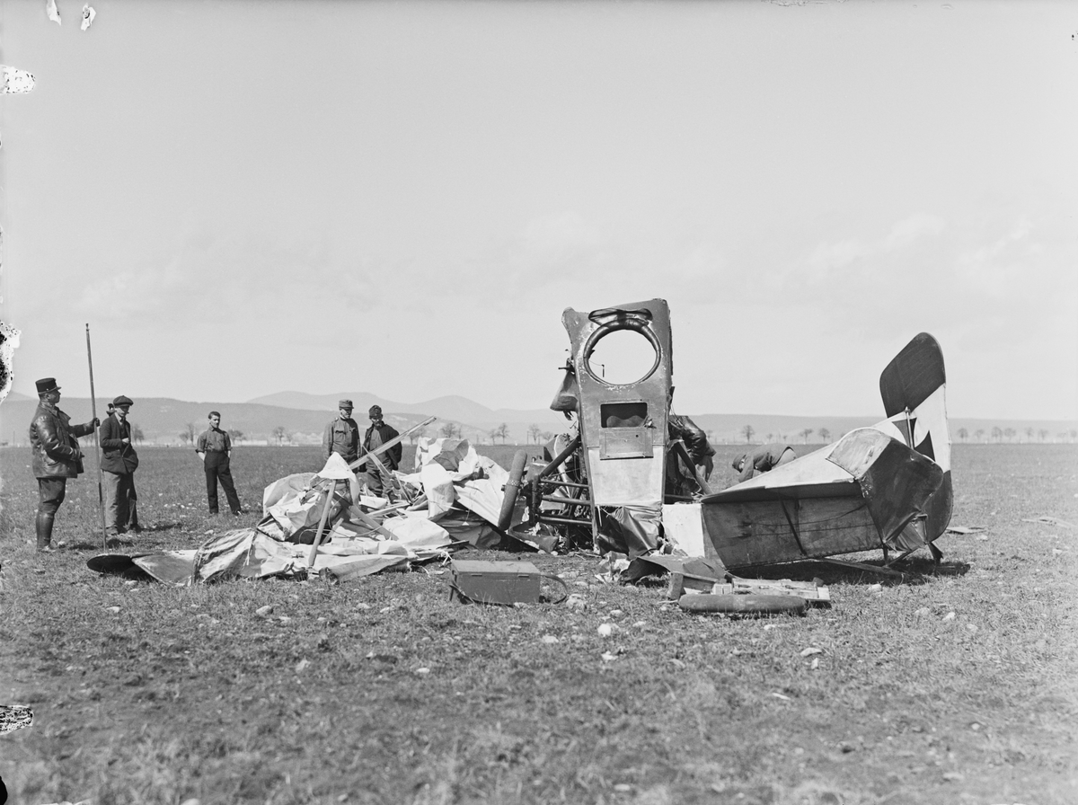 Havererat militärt flygplan Aviatik B.II märkt 32.07 tillhörande Österrike-Ungern ligger på ett flygfält. Militärer och civila står vid flygplanet. Vy bakifrån.