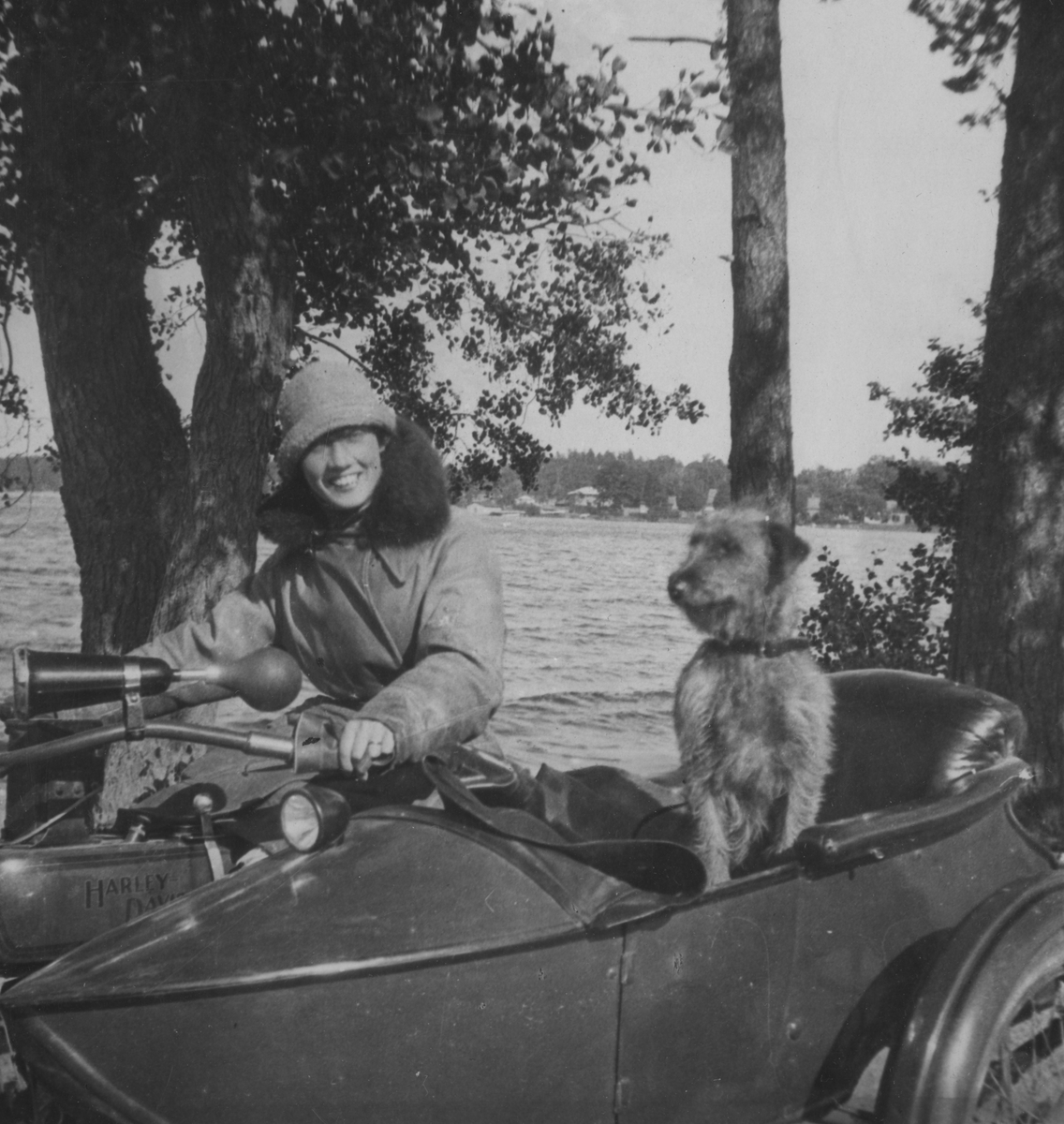 Anna Linderstam och en hund på en motorcykel med sidovagn vid en sjö, 1925.