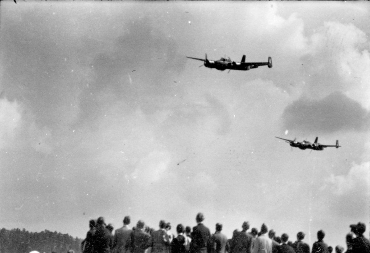Flyguppvisning med flygplan B 18 under Flygets dag på F 2 Hägernäs 1945.