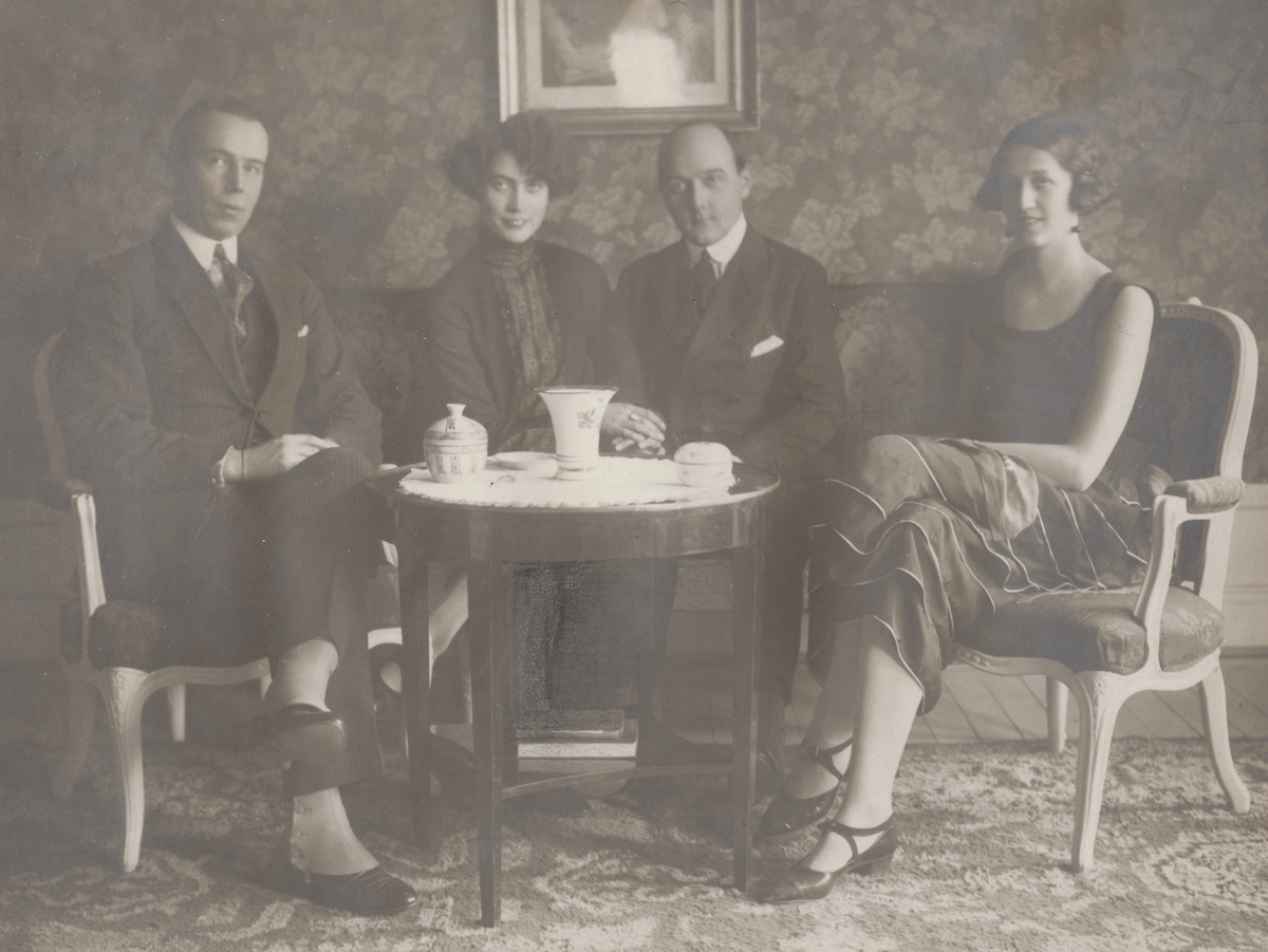 Grupporträtt. Fyra personer i en sittgrupp, inomhus, 1925. Från vänster militären Birger Schyberg, Anna Linderstam, militären Nils Kindberg samt okänd kvinna.