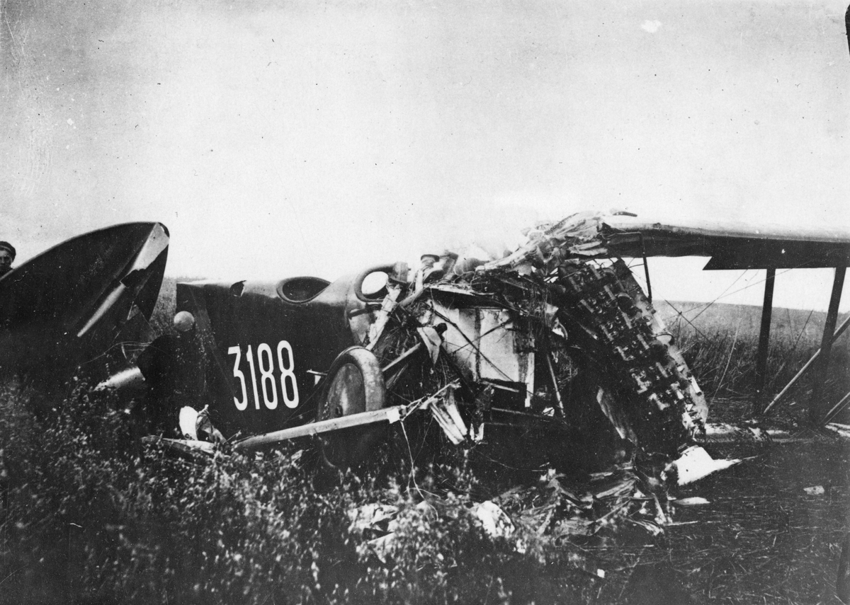 Havererat flygplan Phönix C.I Dront nummer 3188 ur Flygkompaniet ligger på fält.