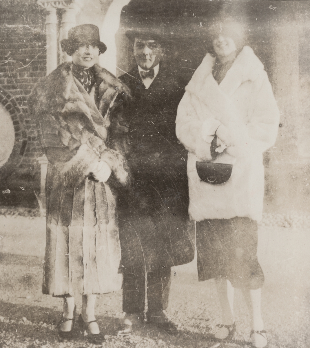 Grupporträtt. Från vänster Anna Linderstam, militären Nils Kindberg samt okänd kvinna utanför byggnad i Strängnäs 1925.
