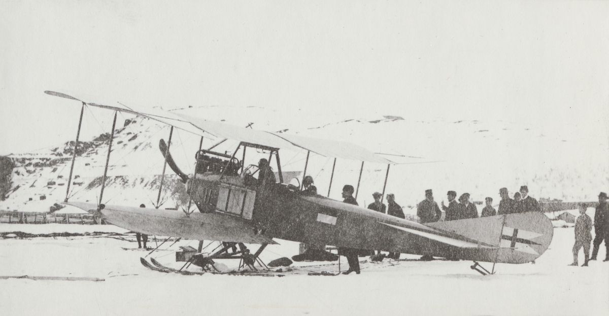 Flygplan Albatros märkt nummer 24 står på skidor på sjön Luoossajärvi i Kiruna, 1 maj 1916.