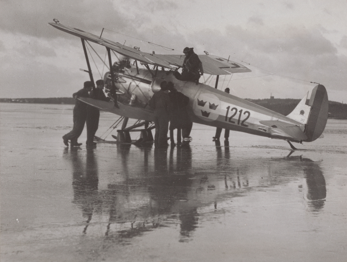 Flygplan J 7, Bristol Bulldog nummer 1212 står på isen vid F 1 Hässlö, vintertid. En flygare står i förarplatsen. Fyra mekaniker vid flygplanet.
