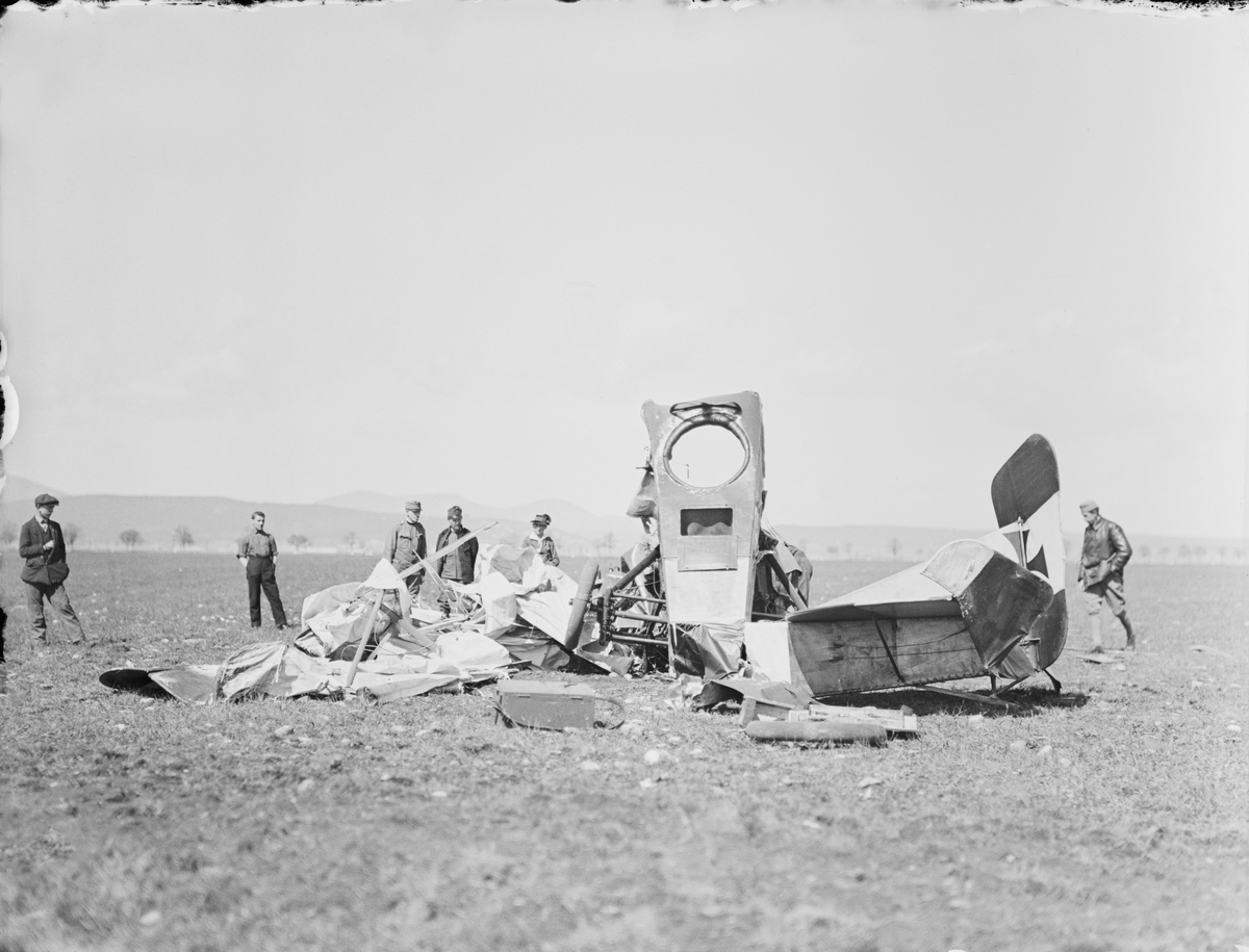 Havererat militärt flygplan Aviatik B.II märkt 32.07 tillhörande Österrike-Ungern ligger på ett flygfält. Militärer och civila står vid flygplanet. Vy bakifrån.