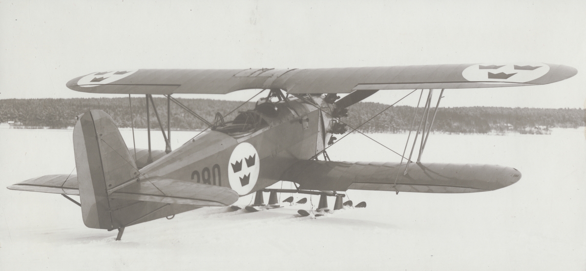 Flygplan J 4, Heinkel HD 19 märkt nr 280 står med skidor på F 2 Hägernäs, cirka 1929-1930. Vy bakifrån.