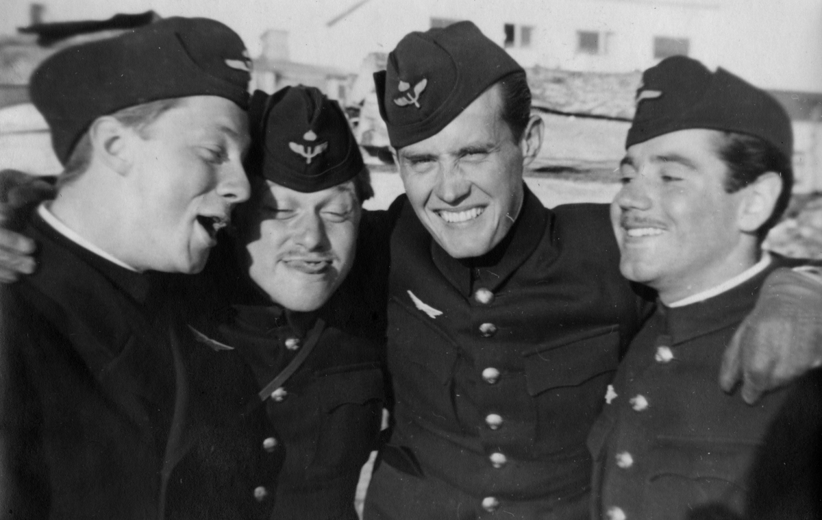 Porträttfoto av fyra glada flygsoldater på F 21 Kallax, cirka 1942.