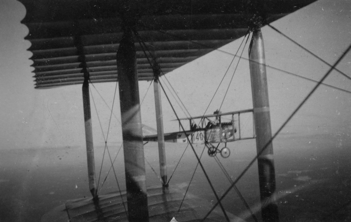 Sidovy av flygplan Albatros FVM 160 märkt nummer 1140 i luften, 1925. Flygbild tagen vinge på ett annat flygplan av Albatros-typ.