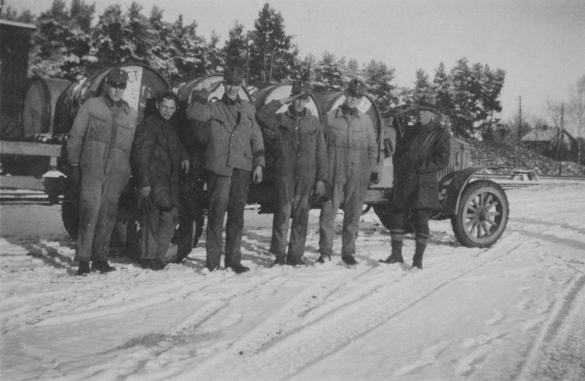 Grupporträtt av flygmekaniker framför en lastbil med tunnor för drivmedel på flaket. Sex män, vintertid.