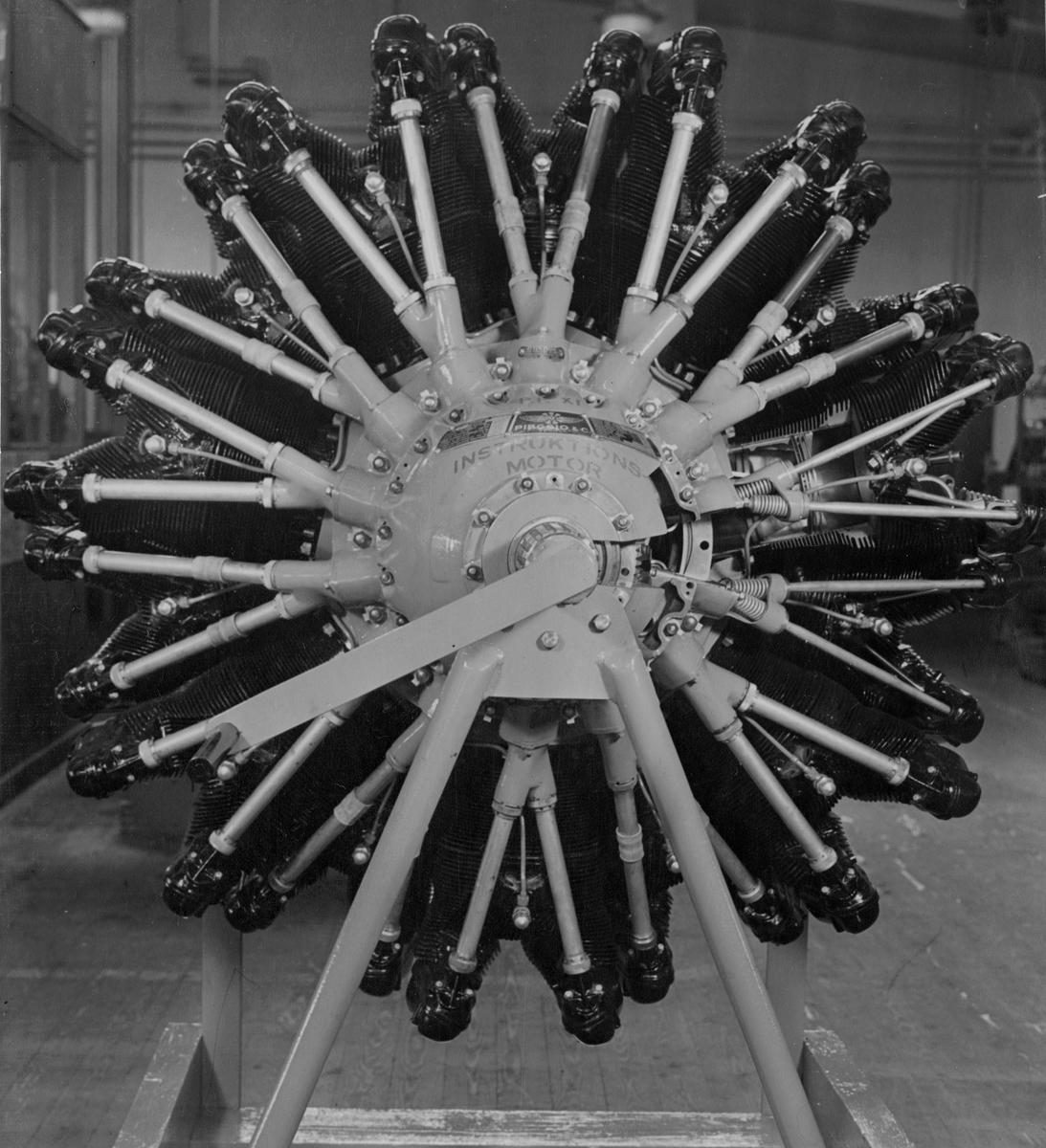 Flygmotor PP XI Piaggio P XI RC-40, tillverkad 1942, för flygplan J 20, B 17 C. Monterat foto med tillhörande information.