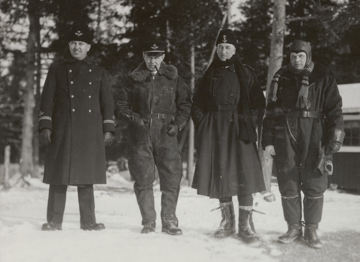 Gruppbild av fyra militära flygare, vintertid, 1930-tal.