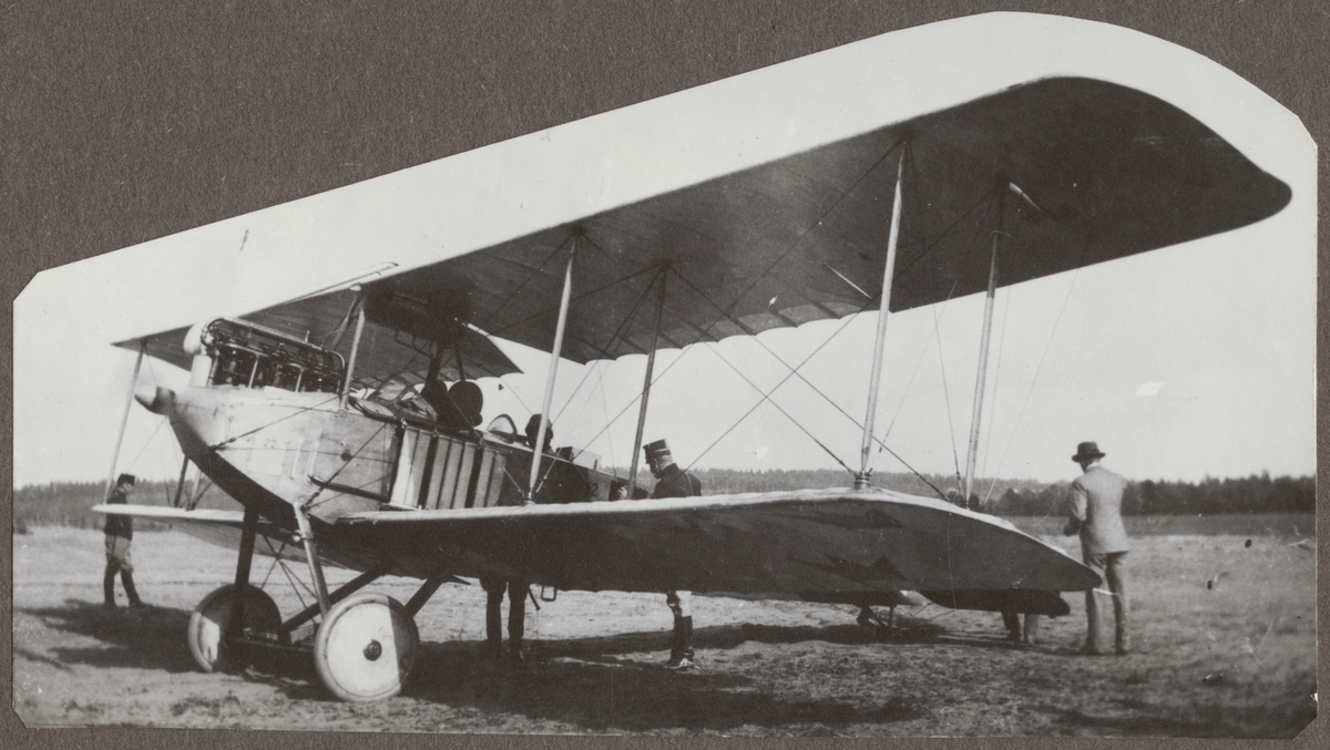 Flygplan SW 12 (Albatros) nr 22 tillhörande Flygkompaniet, står på ett flygfält, cirka 1916-1918. Två flygare i flygplanet och personal bredvid. Under motorkörning.