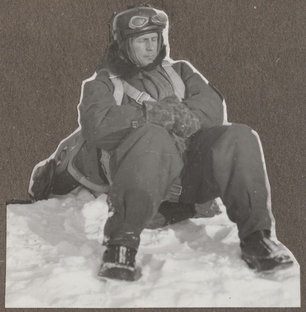 En militär flygare sitter i snön.