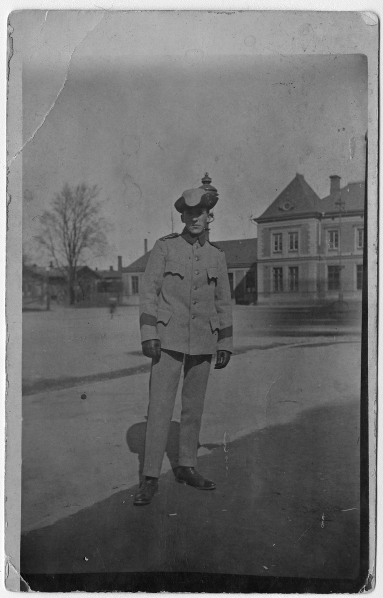 Porträttfoto av värnpliktige flygsoldaten Helmer Andersson, 238 45/24 vid Flygkompaniet, Spanarskolan, Malmen, 1925.