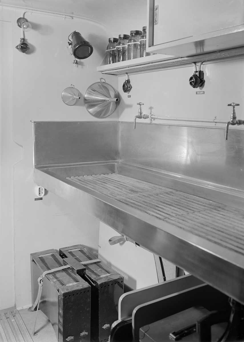 Interiör av fotobil modell m/45. Rum nummer 2, framkallningsrum.