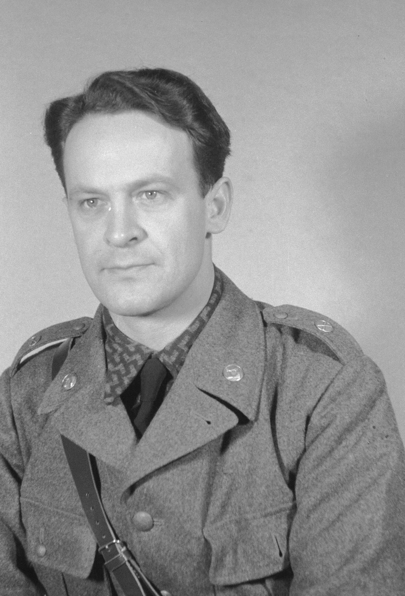 Porträttfoto av oidentifierad soldat vid F 19, Svenska frivilligkåren i Finland under finska vinterkriget, 1940.