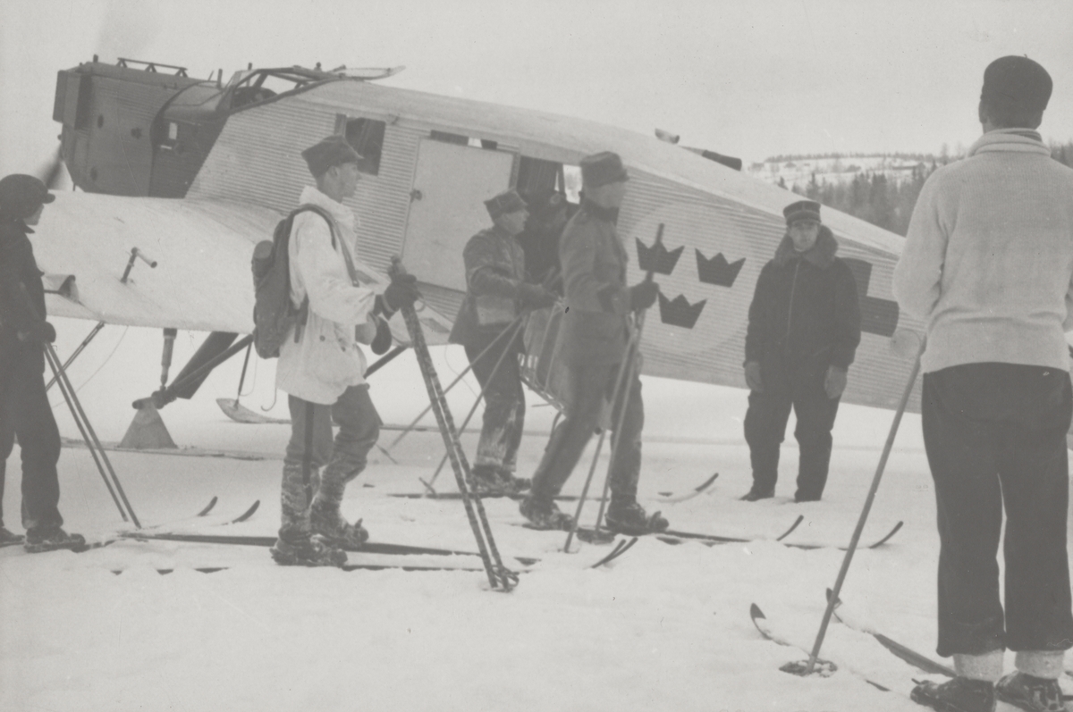 Militärer på skidor står vid ambulansflygplan Trp 2, Junkers W 34, vintertid. Flygare vid planet.