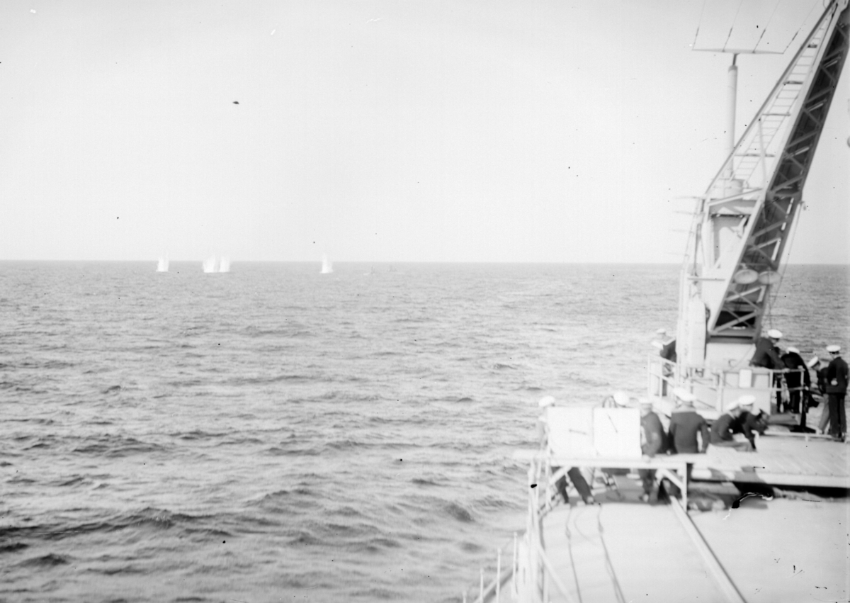 Torpedsprängning från fartyg till sjöss. Nedslag. I förgrunden syns ett fartyg med manskap.