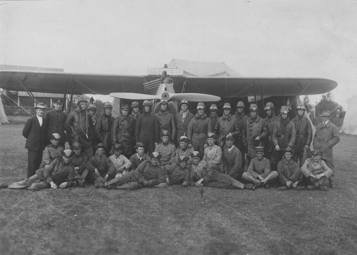 Porträttfotografi av personal vid Flygkompaniet på Malmen framför flygplan Albatross, 1920-tal.